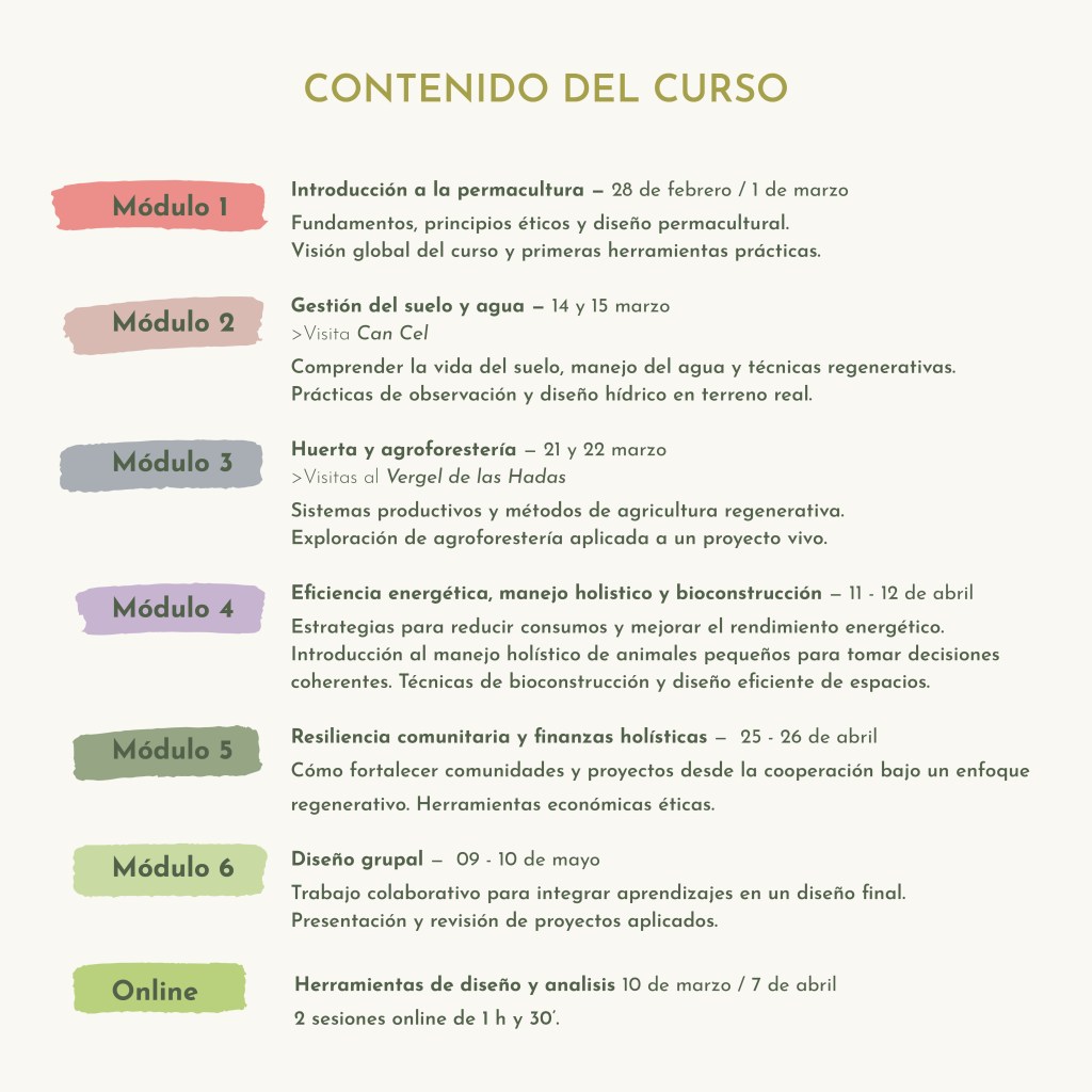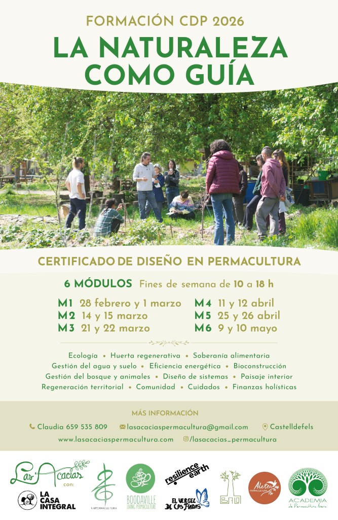 A través de lecciones teóricas y prácticas aprenderás cómo imitar los patrones y relaciones naturales y cómo diseñar sistemas de producción de alimentos que sean productivos, estéticos y respetuosos con el medio ambiente. También cómo aplicar técnicas de agricultura orgánica, jardinería de plantas nativas, diseño de hábitats para animales e insectos, eficiencia energética y bioconstrucción.